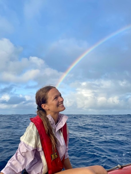 The day began early with the deployment of our research catamaran, Halobates. First, a quick breakfast (heading out on the small boat on an empty stomach is never a good idea!) and then off we go. On the small boat, we were hoping for rain as we want to study freshwater fluxes. And rain came, along with a rainbow. Soaked from both rain and seawater, we waited until the canisters with water samples from the sea surface microlayer and a meter depth from Halobates were filled and then brought them back to Meteor. Once the canisters were back on deck, it was time to distribute the samples – sometimes it’s a fight for every liter. In the laboratory of our working group Marine interfaces, we measure surfactants (surface-active substances) and nutrients (nitrate, nitrite, phosphate, silicate). The first measurement of the day with the fresh samples was taken, and after a CTD (Conductivity, Temperature, Depth) measurement, it was time for lunch, which starts every day at 11:15 AM.