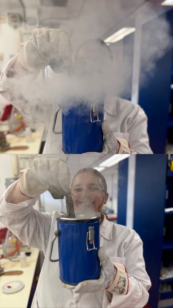 Image: Maia flash-freezing the filters using liquid nitrogen (left) and performing solid-phase extraction with “the Octopus” (right). // Maia friert die Filter mit flüssigem Stickstoff ein (links) und führt eine Festphasenextraktion mit „dem Kraken” durch (rechts).