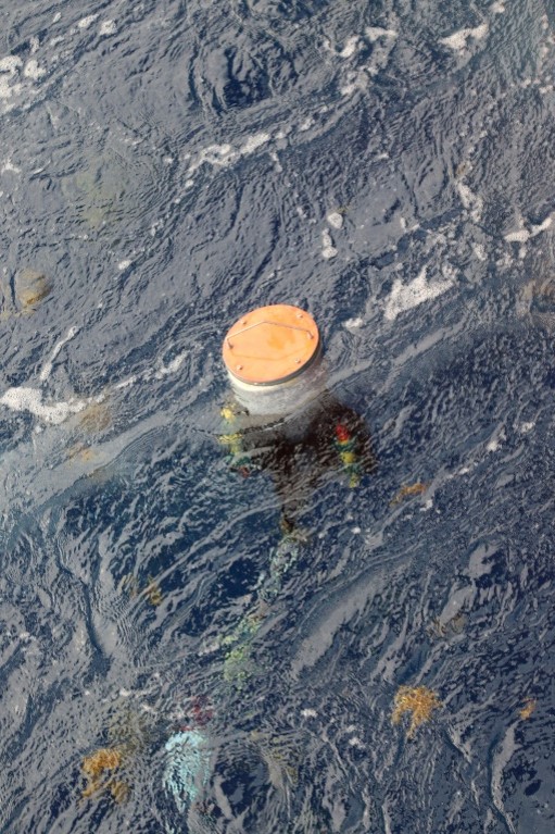 Collecting the drifters was always a highlight! As soon as we arrived at the drifter’s estimated position with the METEOR, a small group of us gathered on the bridge equipped with binoculars, the approximate coordinates, and plenty of motivation. Then it was time to look for tiny red dots, which were often well hidden among the reddish-brown patches of Sargassum. The search was almost like detective work, like the saying of “looking for a needle in a haystack”, only in the open ocean.