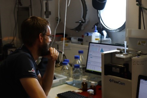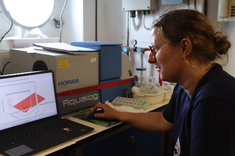 However, we, as the Marine Sensor Systems working group, did not just keep an eye out for our drifters. A large part of our work on board also took place in the lab. Here, we utilized a range of specialized equipment to analyze the water samples collected from the ship’s CTD at the various stations. The PSICAM, a highly sensitive absorption measuring device, can be used to determine the optical properties of dissolved and particulate substances. This was supplemented by the Aqualog, a fluorometer that we used to analyze dissolved organic substances, making it a particularly valuable tool for investigating biogeochemical processes occurring in the surface water. We additionally used a photospectrometer for detailed analysis of light absorption and reflection. These instruments will hopefully provide us with important information about the chemical composition and optical properties of the surface water, thereby contributing to the holistic study of the upper water column.