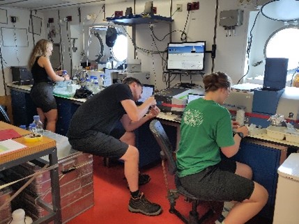Wir als Arbeitsgruppe Marine Sensorsysteme haben aber nicht nur nach unseren Driftern Ausschau gehalten, sondern es spielte sich ein großer Teil unserer Arbeit an Bord auch im Labor ab. Hier kamen eine Vielzahl spezialisierter Geräte zum Einsatz, mit denen wir die gesammelten Wasserproben aus der Schiffs-CTD analysierten. Mit der PSICAM, einem hochsensitiven Absorptionsmessgerät, lassen sich zum Beispiel die optischen Eigenschaften gelöster und partikulärer Substanzen bestimmen. Ergänzt wurde das durch das Aqualog, ein Fluorometer, mit dem wir gelöste organische Substanzen analysierten – ein wertvolles Werkzeug zur Untersuchung von biogeochemischen Prozessen im Oberflächenwasser. Für die detaillierte Analyse von Lichtabsorption und -reflexion nutzten wir außerdem ein Fotospektrometer. All diese Instrumente liefern uns hoffentlich wichtige Informationen über die chemische Zusammensetzung und optischen Eigenschaften des Oberflächenwassers und tragen so entscheidend dazu bei der oberen Wassersäule ganzheitlich zu erfassen.