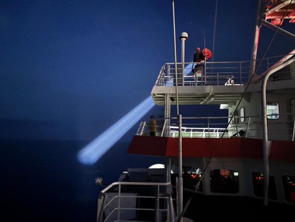 Bild 1: Suchscheinwerfer im Einsatz, um das Sargassumband zu finden // Search Light in action to find the Sargassum patch // Photo: Henning Burmeister