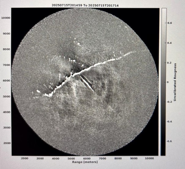 Bild 2: X-Band-Radar zeigt die Rauheit der Meeresoberfläche, die weiße Linie ist das, wonach wir suchten – das Sargassumband // X-Band Radar showing roughness of sea surface, the white line is what we were looking for – the Sargassum // Photo: Henning Burmeister
